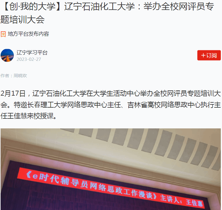 编者按:近日,学习强国辽宁学习平台、辽宁日报·北国号、人民日报客户端·人民号等媒体平台对我校在大学生活动中心举办全校网评员专题培训大会,特邀长春理工大学网络思政中心主任、吉林省高校网络思政中心执行主任王佳慧来校授课进行了宣传报道。现将相关报道转载如下: