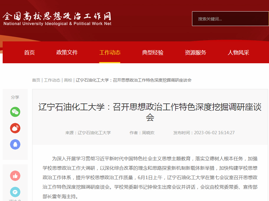 编者按:近日,全国高校思想政治工作网、辽宁日报·北国号等媒体平台对我校为深入开展学习贯彻习近平新时代中国特色社会主义思想主题教育,落实立德树人根本任务,加强学校思想政治工作大调研,以深化综合改革的理念和思路探索新机制新载体新举措,加快构建学校思想政治工作体系,提升学校思想政治工作质量,6月1日上午,在第七会议室召开思想政治工作特色深度挖掘调研座谈会进行了宣传报道。现将相关报道转载如下: