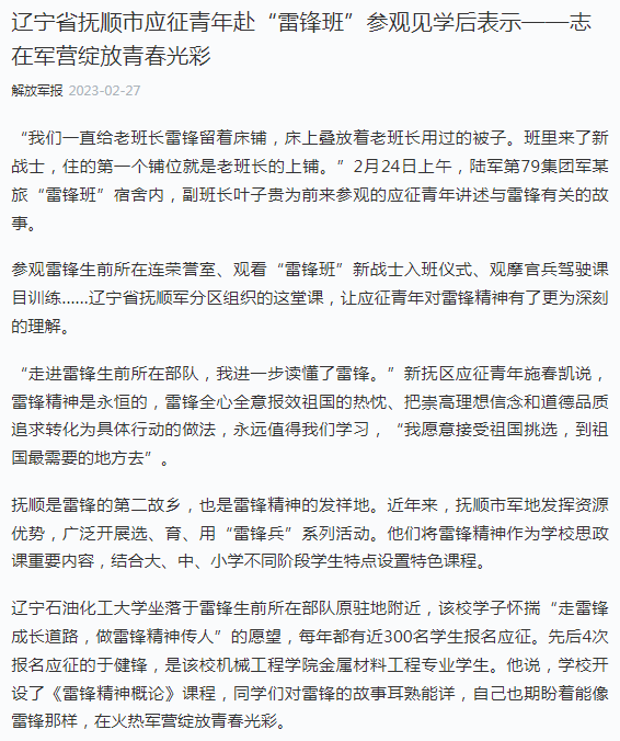 编者按:2月27日,解放军报、学习强国主平台对我校坐落于雷锋生前所在部队原驻地附近,学子怀揣“走雷锋成长道路,做雷锋精神传人”的愿望,每年都有近300名学生报名应征进行了宣传报道,现将相关报道转载如下: