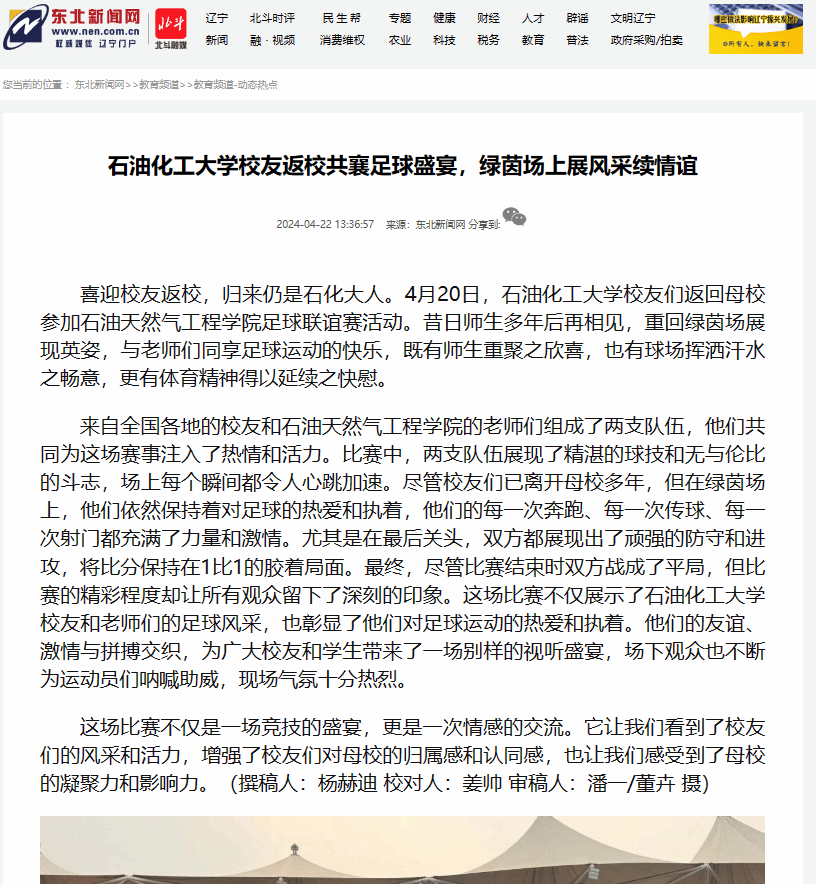 编者按:4月20日,我校校友们返回母校,并参加了石油天然气工程学院足球联谊赛活动。昔日师生多年后再相见,重回绿茵场展现英姿,与老师们同享足球运动的快乐,既有师生重聚之欣喜,也有球场挥洒汗水之畅意。东北新闻网对此进行了宣传报道。现将相关报道转载如下: