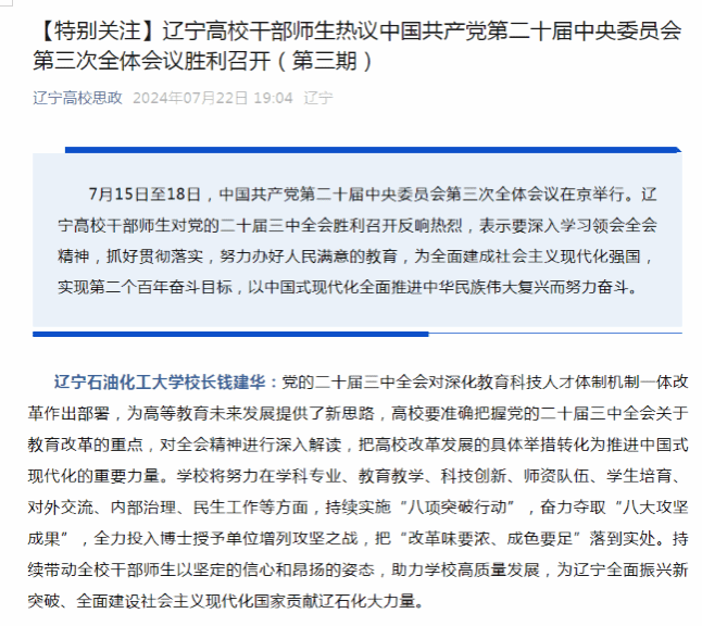 编者按:7月15日至18日,中国共产党第二十届中央委员会第三次全体会议在京举行。辽宁高校干部师生对党的二十届三中全会胜利召开反响热烈。7月22日,辽宁高校思政微信公众号对我校校长钱建华的热议进行了组稿宣传。现将相关报道转载如下: