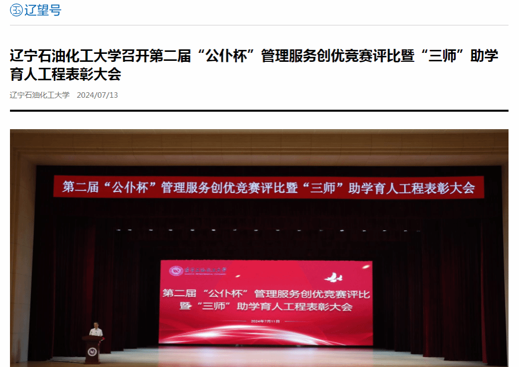 编者按:7月13日,辽宁日报·辽望号、人民日报客户端·人民号对我校召开第二届“公仆杯”管理服务创优竞赛评比暨“三师”助学育人工程表彰大会,隆重表彰“公仆杯”和“三师”助学育人工作中涌现出来的先进集体和个人,营造弘扬先进、崇尚先进、学习先进、争当先进的浓厚氛围进行了宣传报道。现将相关报道转载如下: