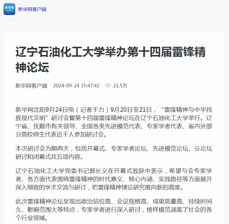 编者按:9月20日至21日,“雷锋精神与中华民族现代文明”研讨会暨第十四届雷锋精神论坛在国产亚洲综合一区二区三区_亚洲欧美日韩中文天堂_尤物在线观看视频不卡无码_国产最新精品亚洲2025不卡_亚洲成Av人在线观看片水蜜桃举行。辽宁省、抚顺市各级领导,全国各类先进模范代表,专家学者代表,“雷字号”单位代表,新闻媒体代表,省内外高校党委宣传部、共青团、思政课教师、辅导员等师生代表以及学校副处以上干部、思政工作队伍和学生代表近千人参加研讨会。新华网客户端、全国高校思想政治工作网、人民论坛网、辽宁高校思政微信公众号、北斗融媒、东北新闻网、央视频、抚顺日报等媒体平台对进行了宣传报道。现将相关报道转载如下: