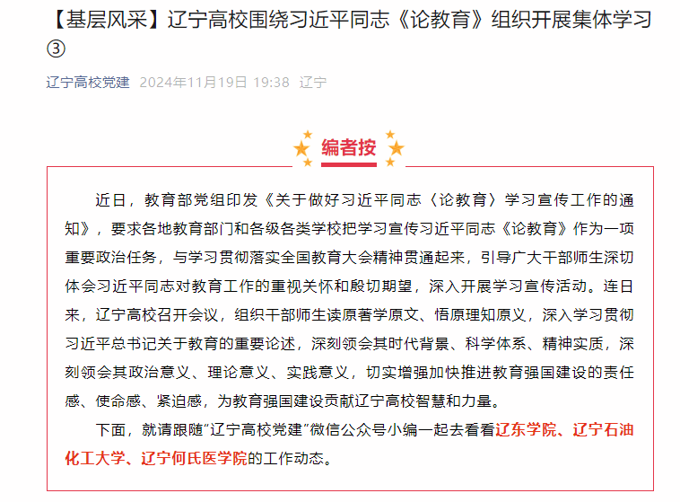 辽宁高校党建微信公众号:【基层风采】辽宁高校围绕习近平同志《论教育》组织开展集体学习③